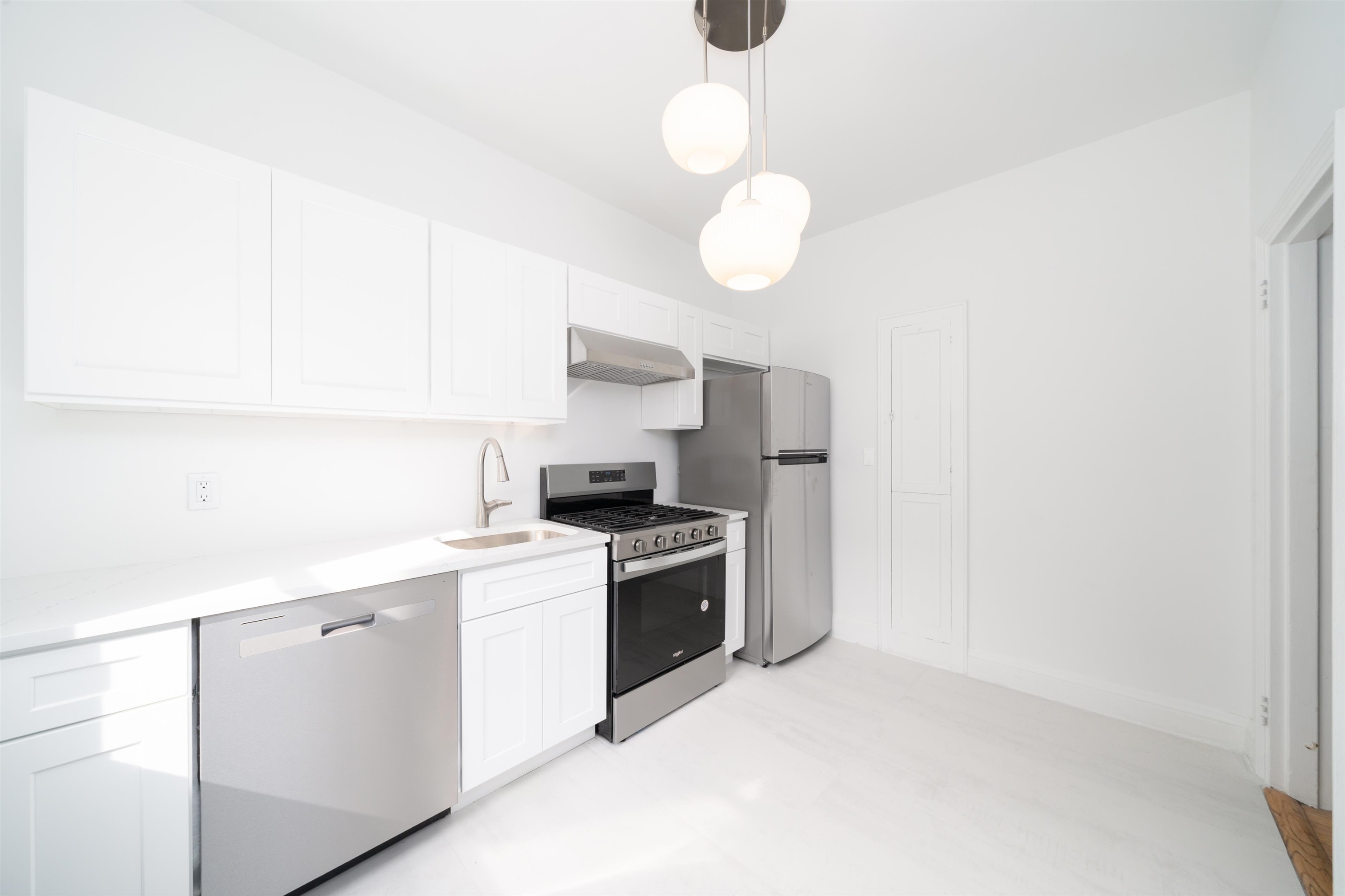 Lots of natural light in a large corner 1 bed, 1 bath unit located across the street from NYC transportation. Brand new eat in Kitchen with Stainless Steel Appliances, gas stove, dishwasher and Refrigerator. Arch Opening leads to hallway and a large living room and bedroom. Hardwood floors throughout with a dark border. Vintage shade in bathroom from Etsy and wall sconces. Heat & hot and cold water are included in the maintenance. Building also has a laundry room app operated. Close to schools, shopping, NYC transportation (NJ transit bus 154 & 88 are at corner), major highways & James Braddock Park.