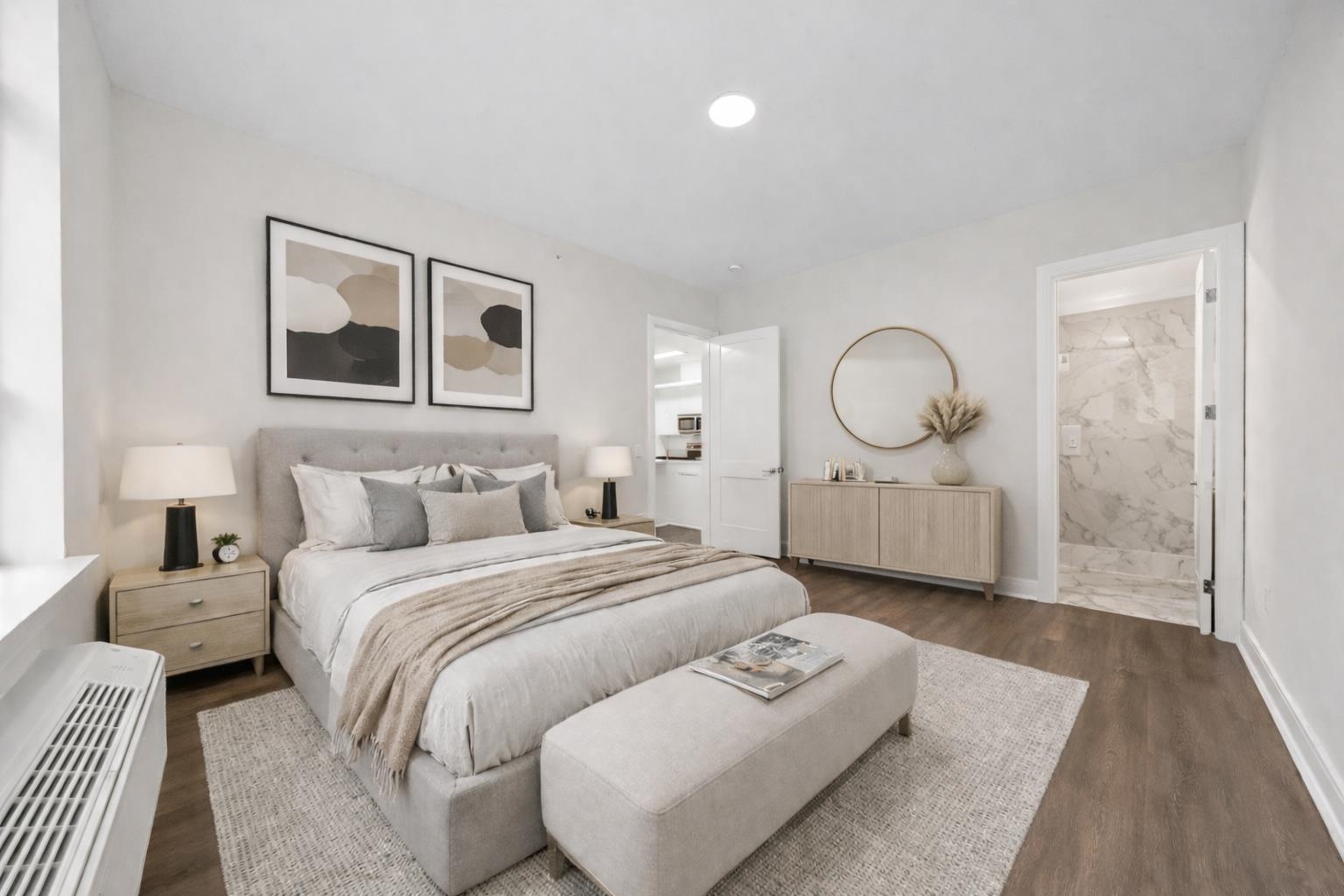 Beautifully designed 2 bedroom, 2 bath residence at The Marq, 119 Peter Street, offering a modern open concept layout with wide-plank hardwood floors, oversized Pella windows with custom solar shades, and premium finishes throughout. The contemporary kitchen features waterfall quartz countertops, Samsung stainless steel appliances, soft close cabinetry, and recessed lighting, while the spacious bedroom offers ample closet space and a full-size in-unit washer and dryer. Residents enjoy access to a Mircom mobile entry system, secured package room, fitness center, bike storage, and optional indoor parking. Ideally located in Union City just minutes from Manhattan with frequent bus service and easy access to major highways, tunnels, ferries, and rail, this home combines comfort, style, and unbeatable convenience!