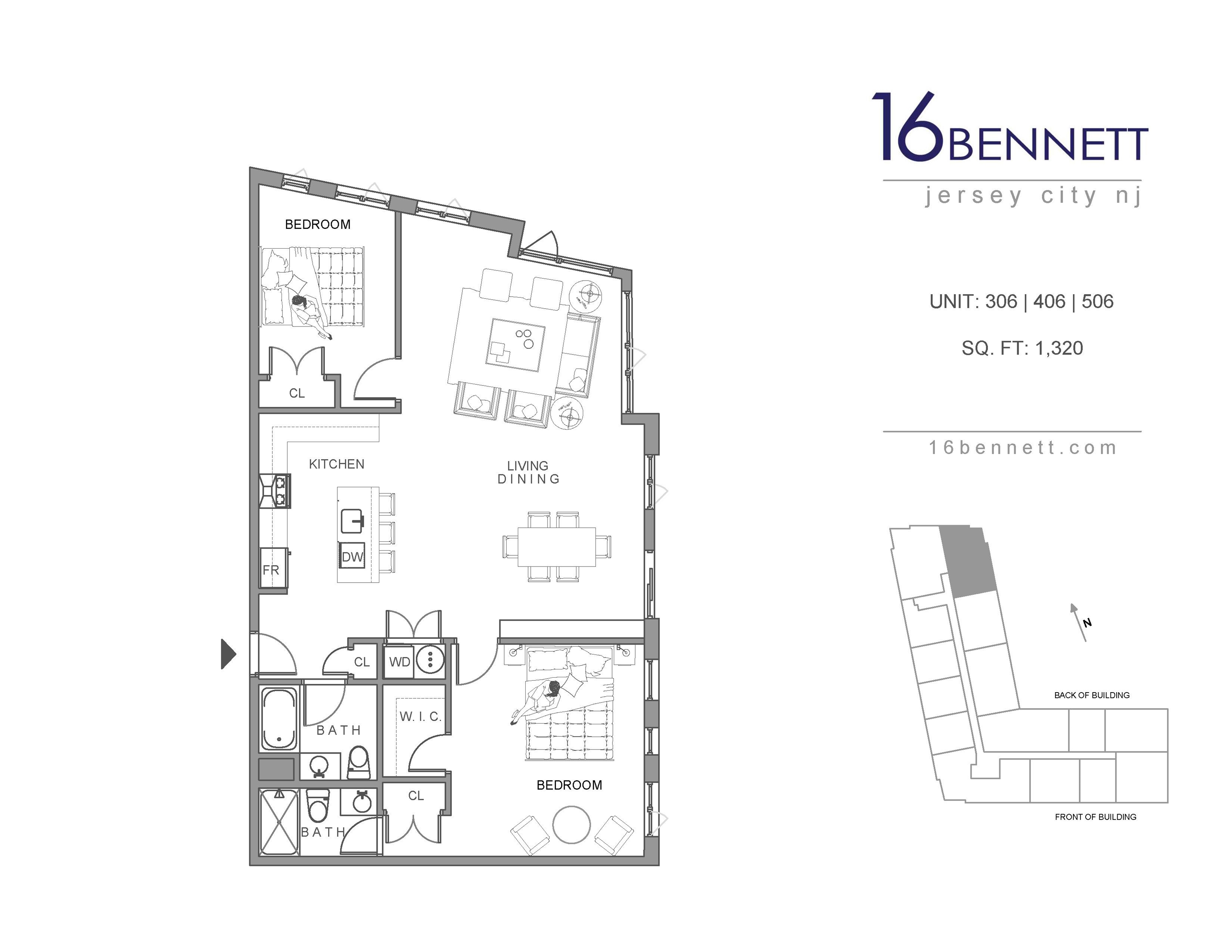 Come and see this gorgeous and modern top floor two bedroom, two bathroom apartment located at 16 Bennett St. in Jersey City! The building offers keyless entry, a luxurious roof deck that offers panoramic views of New York City, West New Jersey, and the Hackensack River. Also included are a communal gym and back yard with gas grills and a fire pit. The units have massive living spaces to match with high end finishes. The apartments boast large walk in closets, and include full size washer and dryers. With sprawling hardwood floors throughout and high end stainless steel appliances, no detail has been spared in creating the perfect rental apartment living experience. 16 Bennett offers free shuttle service to the JSQ PATH Station. Starbucks is available in front of the building, and parking is available for an additional monthly fee.