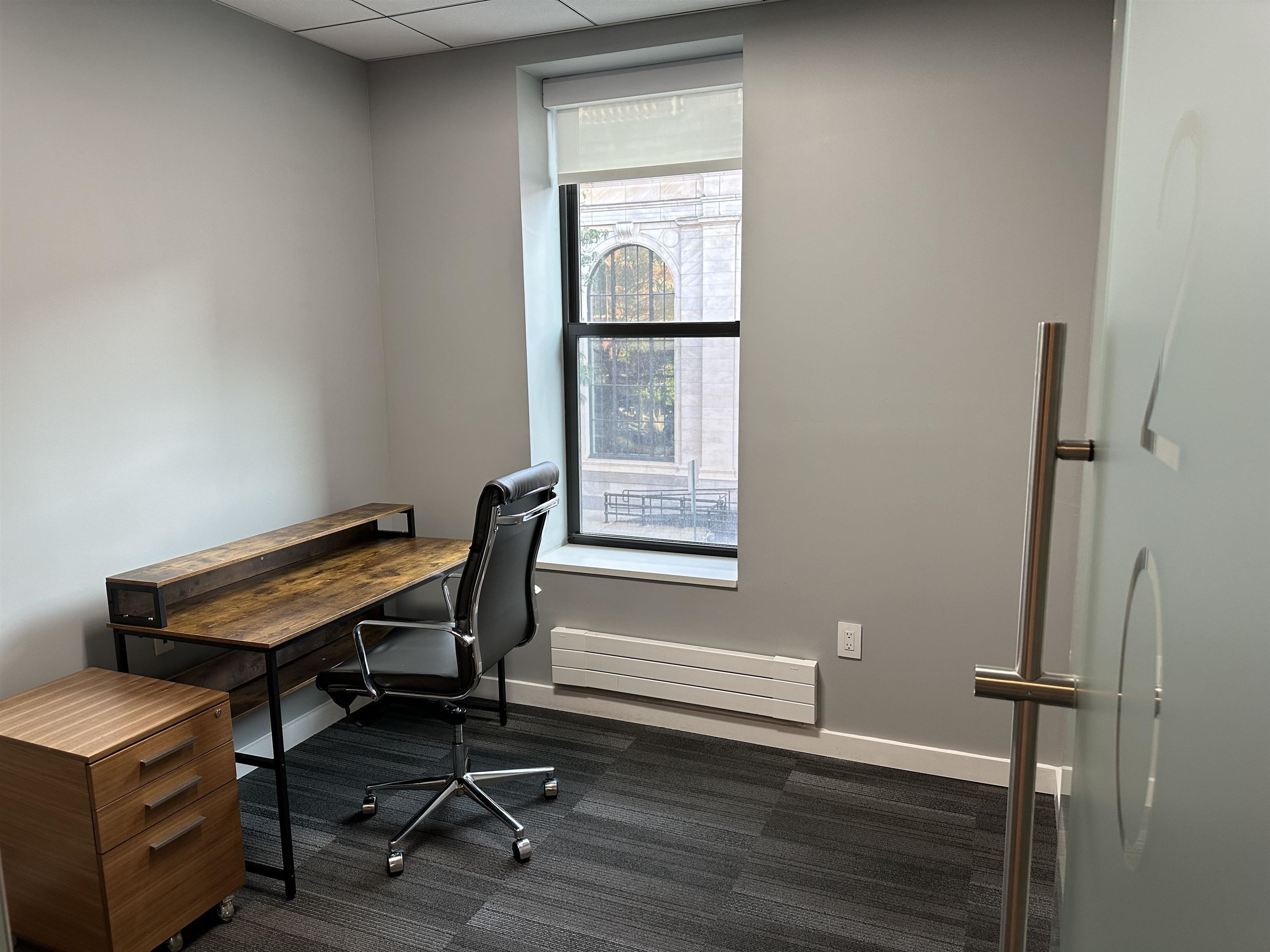 Beautiful sunny windowed private office facing Newark Street. Welcome to Eureka luxurious co-working experience with private offices. Fully Furnished Office includes: Your own Lock and Key, Desks, chair, filing cabinets, guest chairs, VOIP phone and blazing fast wi-fi. Keyless building entry, security cameras, conference room with Apple TV to project from laptop. Several common areas for waiting and lounging, kitchenette with coffee station, microwave and fridge, two Live walls of plants, your own mailbox and restrooms on each floor. Available Now with Flexible lease terms. Excellent location across from Starbucks in downtown Hoboken's business district, 1 block from Washington St and the PATH, Ferry Terminal, Taxis, NJ Transit Trains and Buses which makes it an ideal spot for Easy commute.